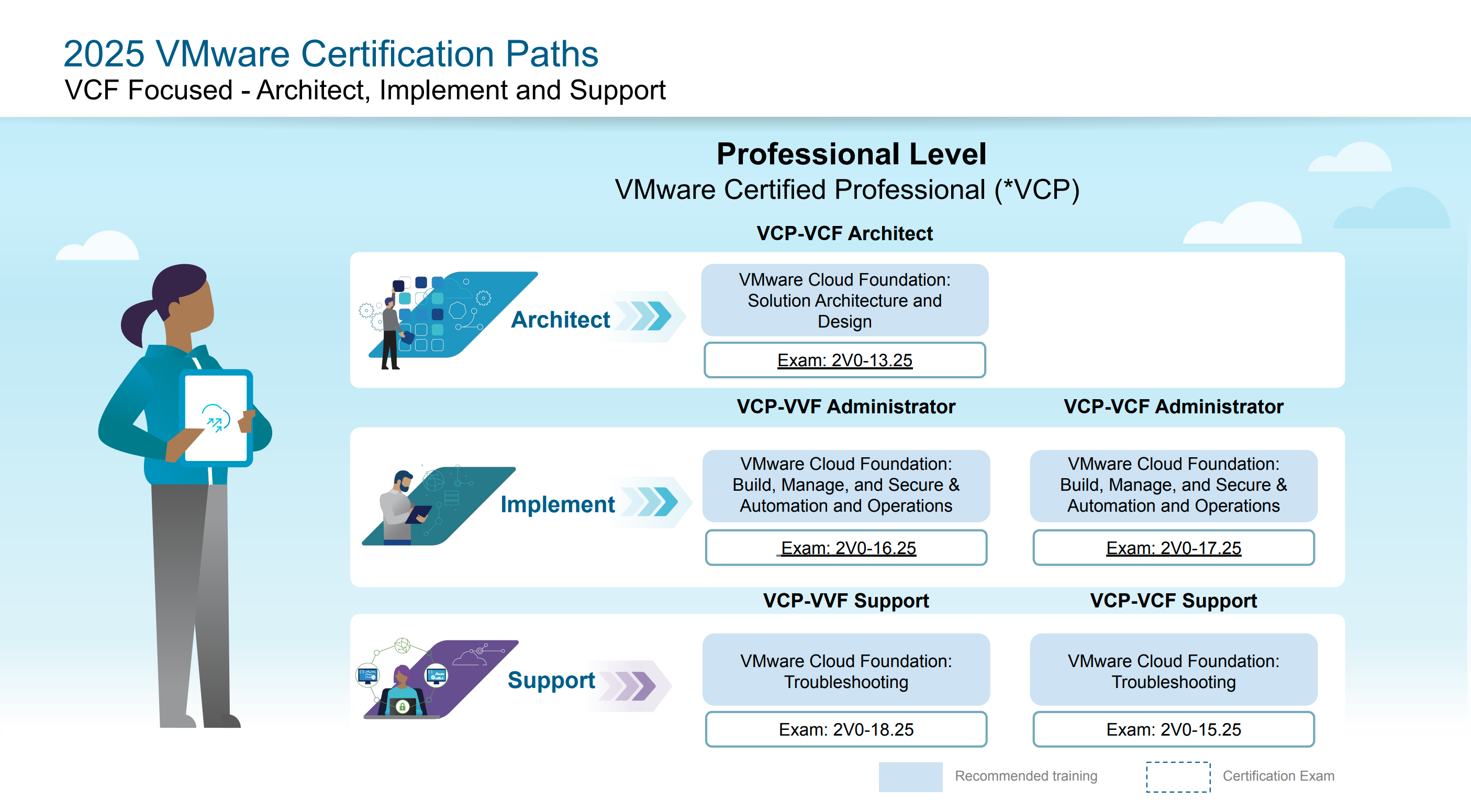 VMware Certifications validate the critical skills required to deploy, integrate, and manage the technologies that drive customers’ desired business outcomes. Organized across multiple technology domains and proficiency levels, these certifications support learners at every stage—from those entering the field to seasoned experts seeking advanced validation.